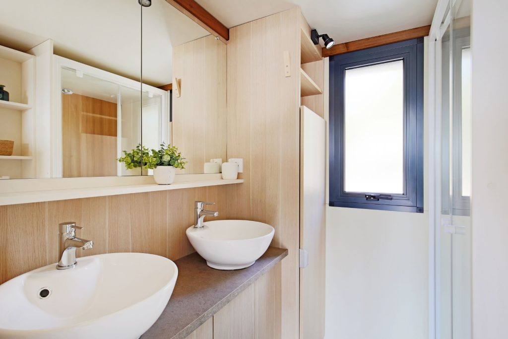 Salle de bain avec sa double vasques et cabine de douche, comme à la maison 🙂
